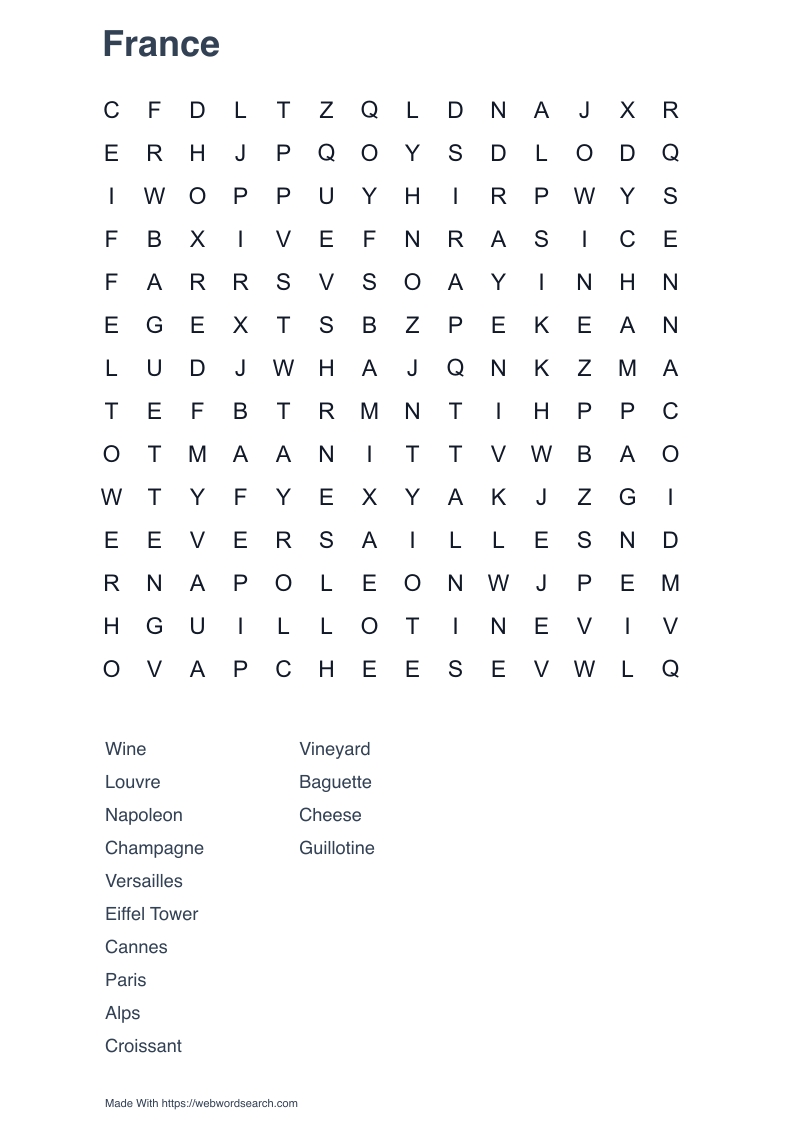 In this Word Search puzzle, you will find words related to France. The country is known for its art, food, wine, culture, and history.