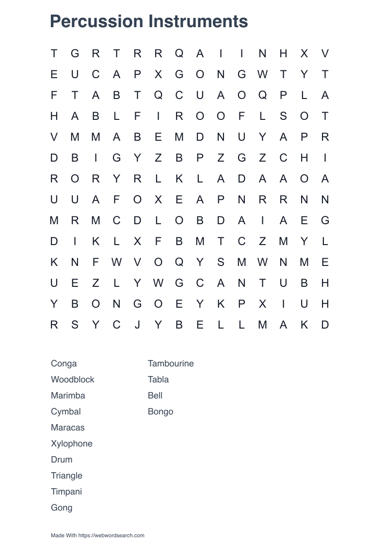 Percussion instruments are as old as humankind. These musical tools have been used in every culture and throughout history. Today, they continue to be an essential part of music-making around the world. This Word Search features some of the most popular percussion instruments including drums, cymbals, maracas, and tambourines.
