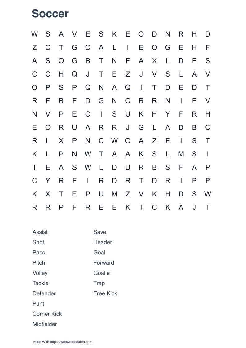 This Word Search puzzle is a great way for soccer fans of all levels of expertise to learn new terms and improve their vocabulary. The terms are all related to the game of soccer, from basic concepts to more complicated strategies. With 18 words to find, this puzzle is a good way to improve your knowledge of the sport while having some fun.